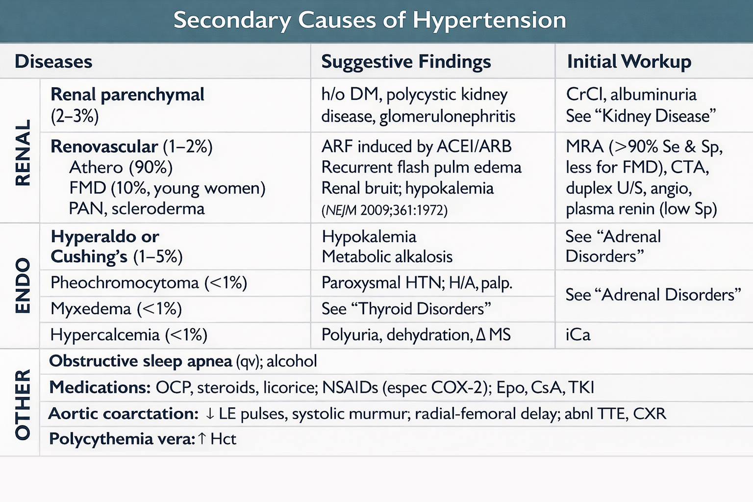 - Secondary: Consider if Pt <20 or >50 y or if sudden onset, severe, refractory HTN
