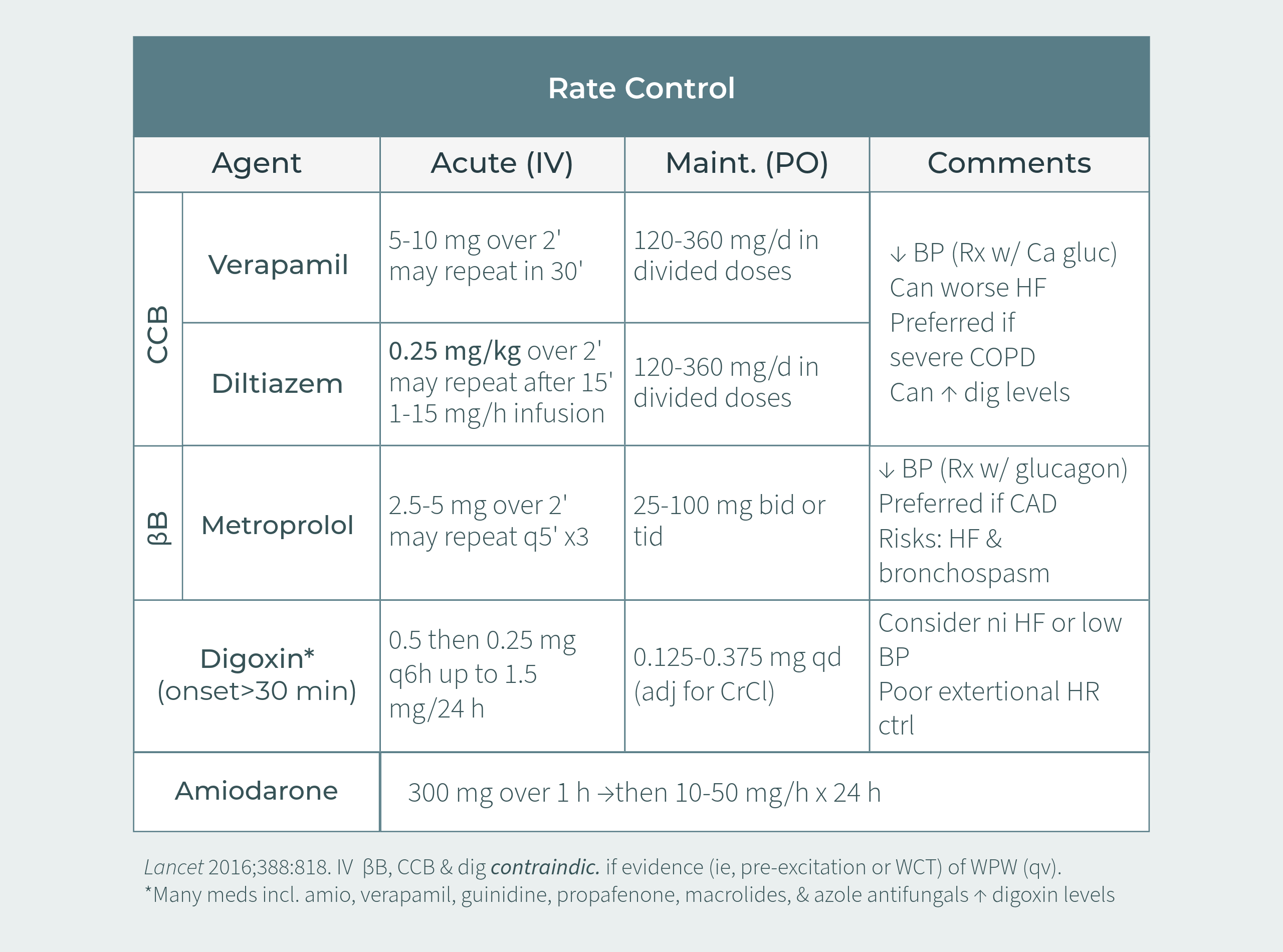 - Consider if sx w/ rate control (eg, HF), difficult to control rate, or tachycardia-mediated CMP